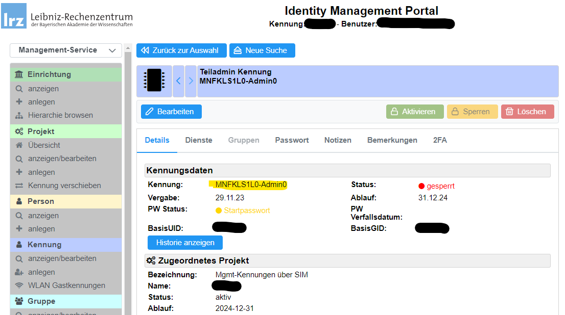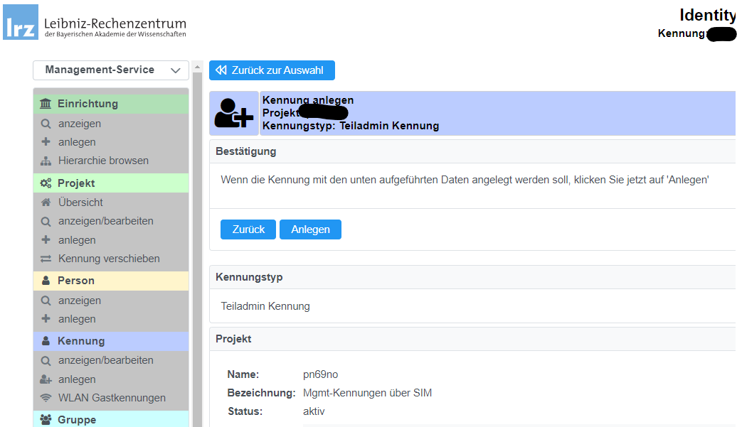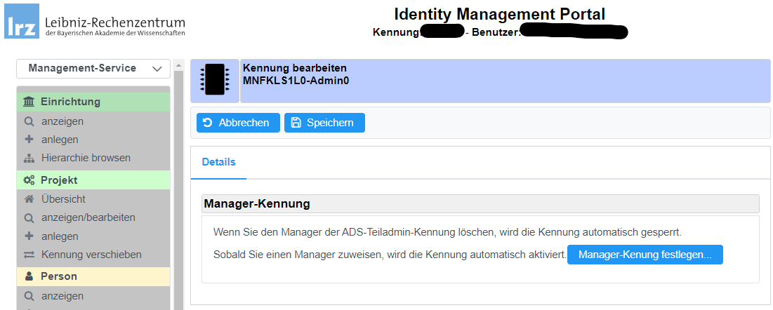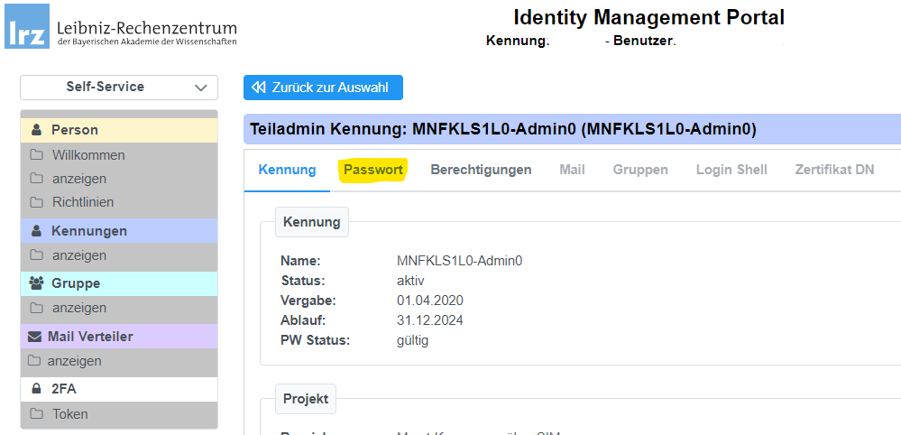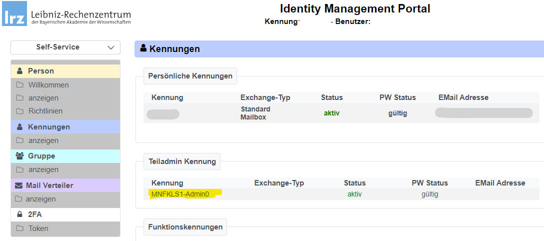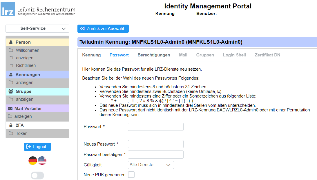 Damit die neue Teiladmin aktiv wird, muss sich nun der Nutzer, dem die Kennung zugeordnet wurde, sich am https://idmportal2.lrz.de/ mit seiner persönlichen Kennung anmelden.