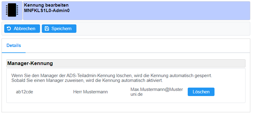 Die Teiladminkennung muss einem Nutzer zugewiesen werden. Wenn die Kennung deaktiviert oder gelöscht wird, wird auch die Teiladminkennung wieder deaktiviert. Dies soll verhindern, dass es herrenlose Teiladminkennungen gibt.