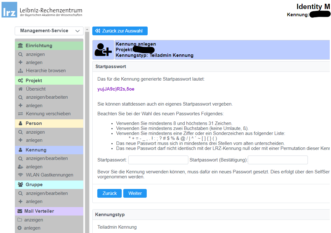 Sie können ein eigenes Startpasswort setzen oder das automatisch generierte verwenden. Mit dem Startpasswort muss der Nutzer die Kennung später am https://idmportal2.sim.lrz.de/ aktivieren, bevor die Teiladminkennung danach verwendet werden kann!