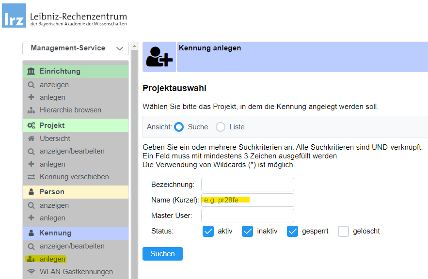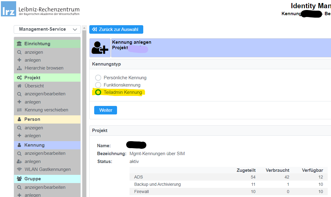 Wenn Ihr Projekt für Teiladmin-Kennungen freigeschaltet ist, können Sie Teiladmin-Kennungen wie andere Kennungen unter "Kennung"→"neu anlegen" erzeugen, indem Sie dort bei der Kennungsart die entsprechende Checkbox anklicken. Die Anzahl Teiladmin-Kennungen ist jedoch begrenzt - üblicherweise 3 pro Projekt. Sollten Sie mehr Teiladmin-Kennungen benötigen, teilen Sie das bitte dem LRZ Servicedesk mit.