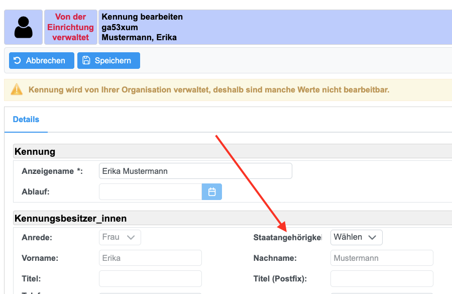 Die Nationalität können Sie eintragen, indem Sie in der Kennungsansicht auf "Bearbeiten" klicken.