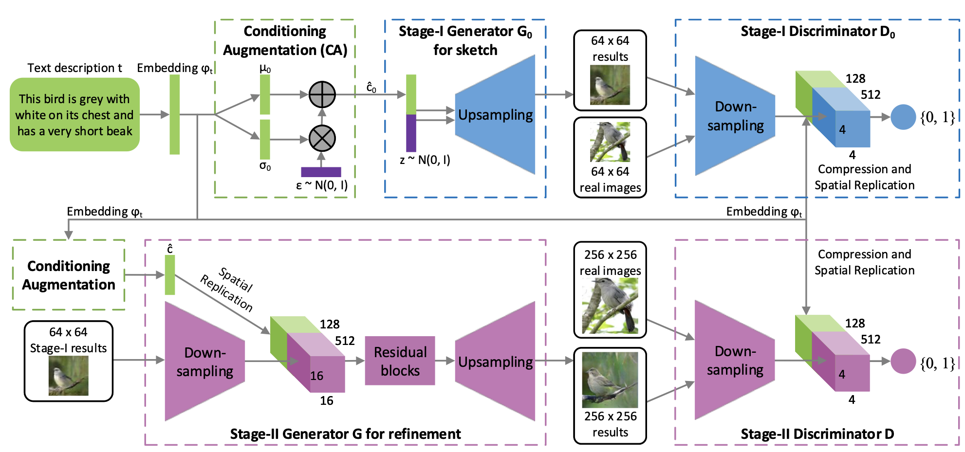 A pioneer text-to-image GAN-based method is StackGAN [2]. StackGAN is a generative model that is employed to produce high-resolution images from text descriptions. A Stage-I generator and a Stage-II generator make up its two stages. A low-resolution image is produced by the Stage-I generator using a text description it catches a rough shape and basic colors. the text description is first encoded by an encoder to generate text embedding. Latent space for the text embedding is often highly dimensional which typically results in discontinuity in the embedding space which is undesirable. Hence, Conditioning augmentation is needed. However, a high-resolution image is produced by the Stage-II generator. The output of the stage-II generator is conditioned to both the low-resolution image and the written description. A high-resolution image can only be created by the Stage-II generator when the Stage-I generator has been trained to provide an image with enough information. The model learns to produce high-resolution images that are compatible with the text description since the two generators are trained together.
