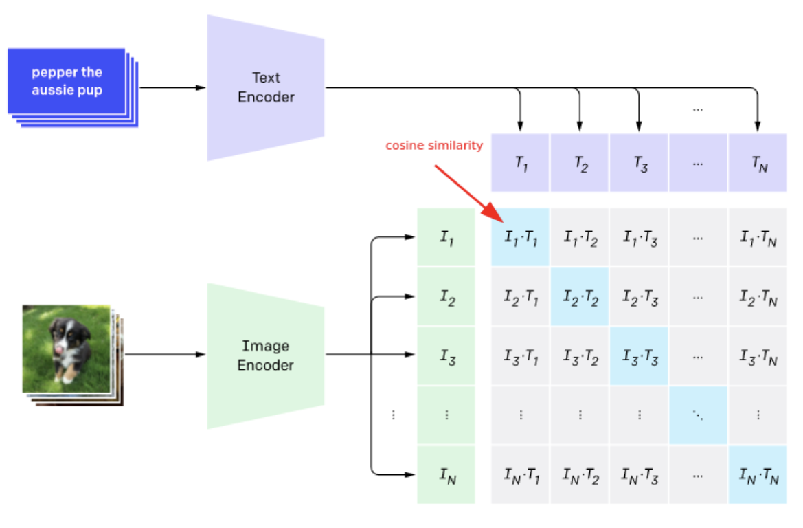 The model is trained to predict the likelihood of a given image and text pair being true. It does this by using a contrastive loss function, where the model is trained to maximize the similarity between the image and text representations for true pairs and minimize the similarity between the image and text representations for false pairs as shown in Figure 4. CLIP is pre-trained on a large dataset of images and their associated text. Once pre-trained, the model can be fine-tuned on a smaller dataset for a specific task, such as image captioning or image-text retrieval. The pre-training allows the model to learn a general understanding of the relationship between images and text, which can then be fine-tuned for specific tasks.