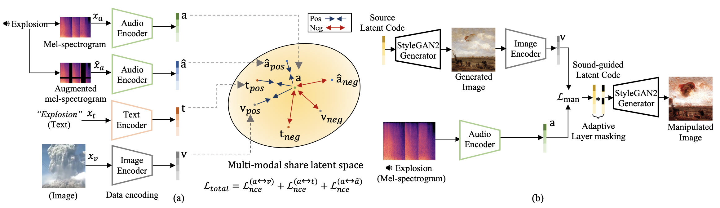To create a multimodal latent representation in (a), they train a group of encoders on data from three different modalities (audio, text, and image). In the (CLIP-based) embedding space, samples of a positive triplet pair's latent representations are mapped close together, whereas samples of a negative triplet pair's latent representations are mapped farther apart (left).