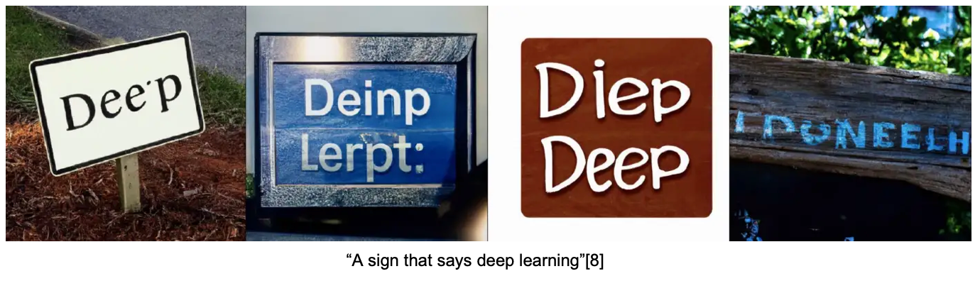 Spelling: | DALL-E-2 excels at drawing but fails miserably at spelling. The lack of spelling information from the text provided in dataset photos in DALL-E-2 could be the cause. DALL-E-2 cannot accurately draw something if it is not represented in CLIP embeddings. When given "a sign that says deep learning," DALL-E-2 produces the following: |