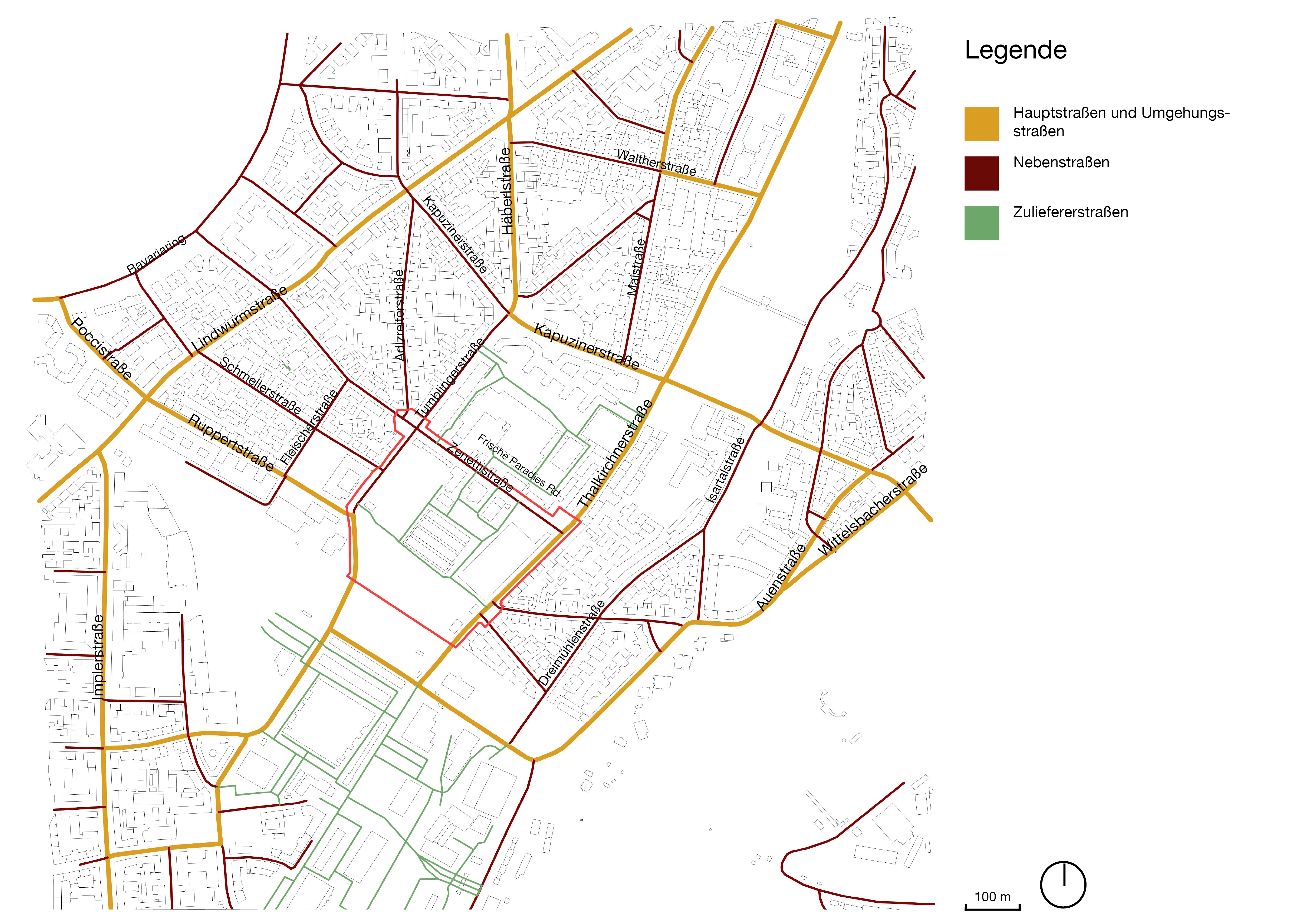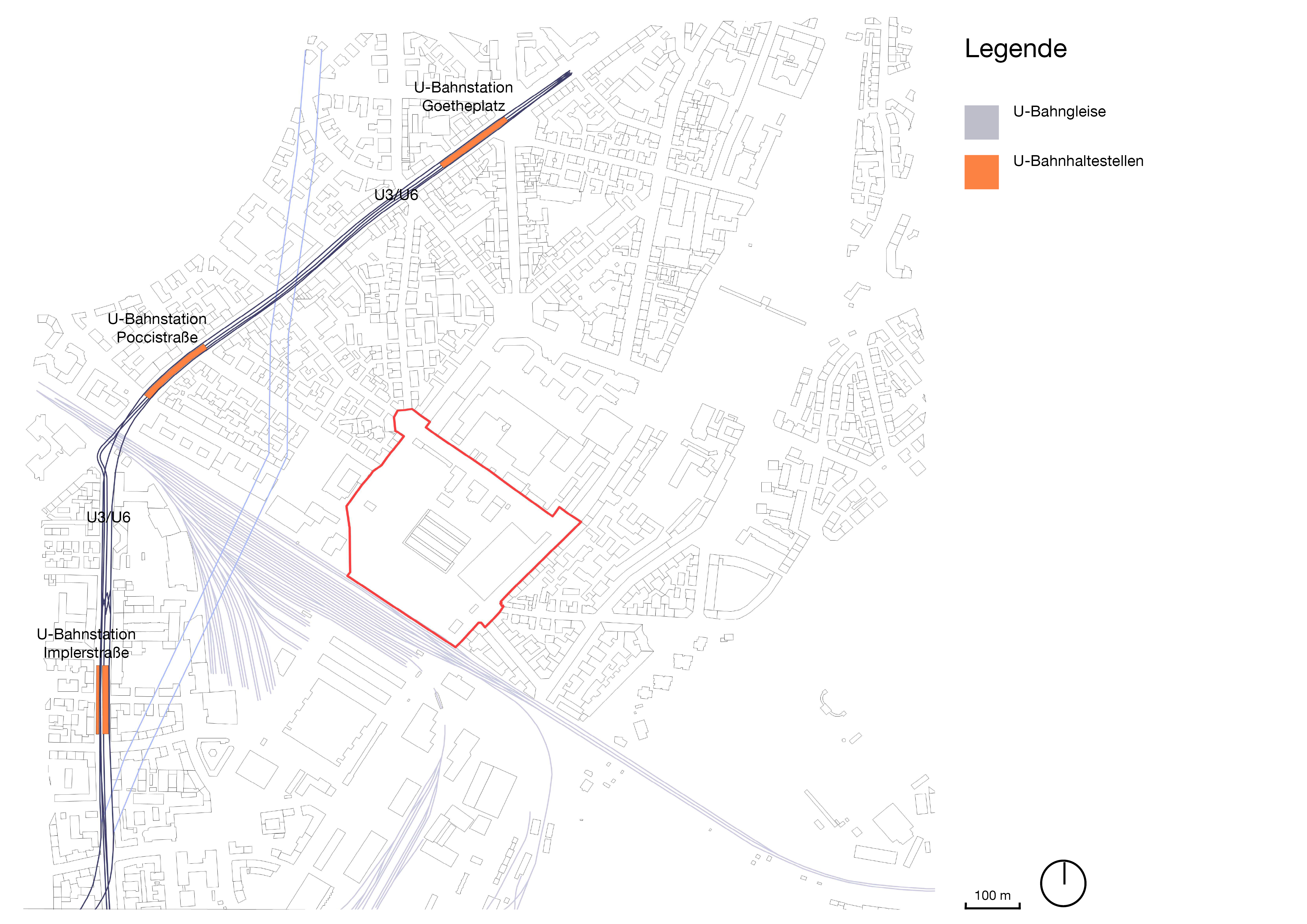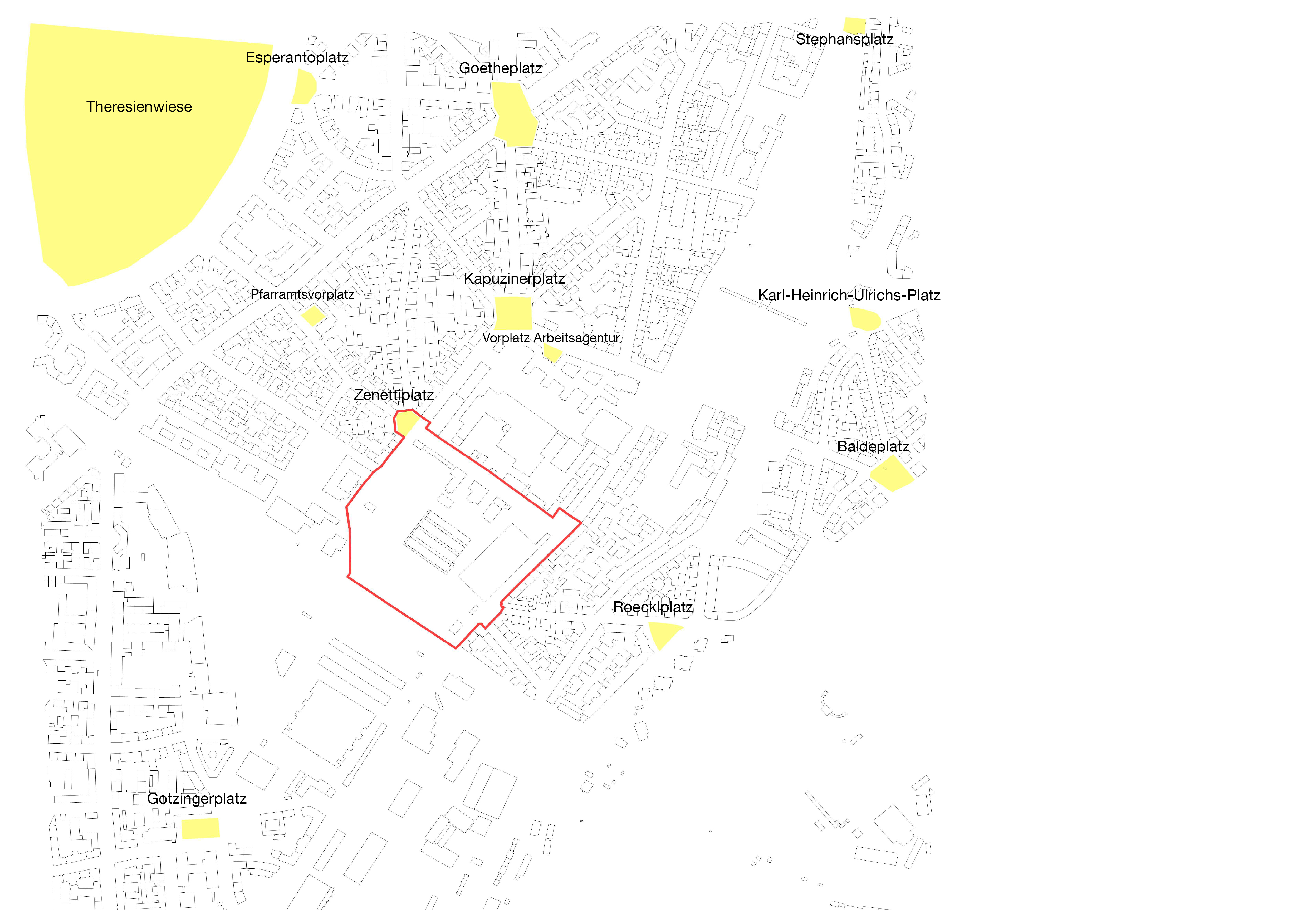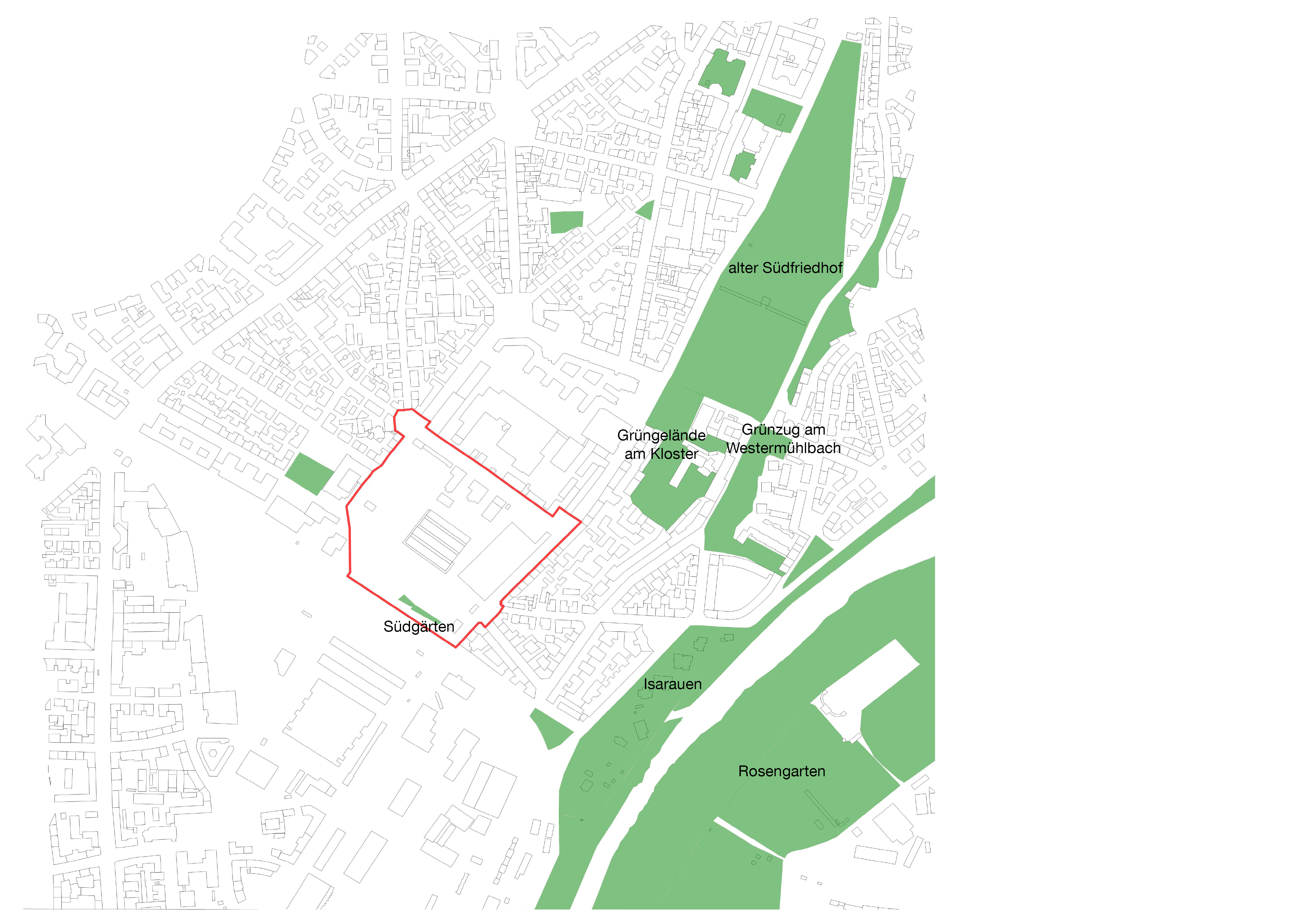 Zur Einordnung des städtebaulichen Umfelds wird ein Umgriff der Betrachtung definiert. Dieser reicht im Norden bis zur Theresienwiese, dem Goetheplatz und dem alten Südfriedhof, im Süden bis zur Großmarkthalle und dem Gotzinger Platz. Im Osten grenzt der gewählte Ausschnitt an das Ende des alten Südfriedhofs, den Westermühlbach und die Isarauen. Im Westen verläuft die Grenze entlang der Implerstraße.