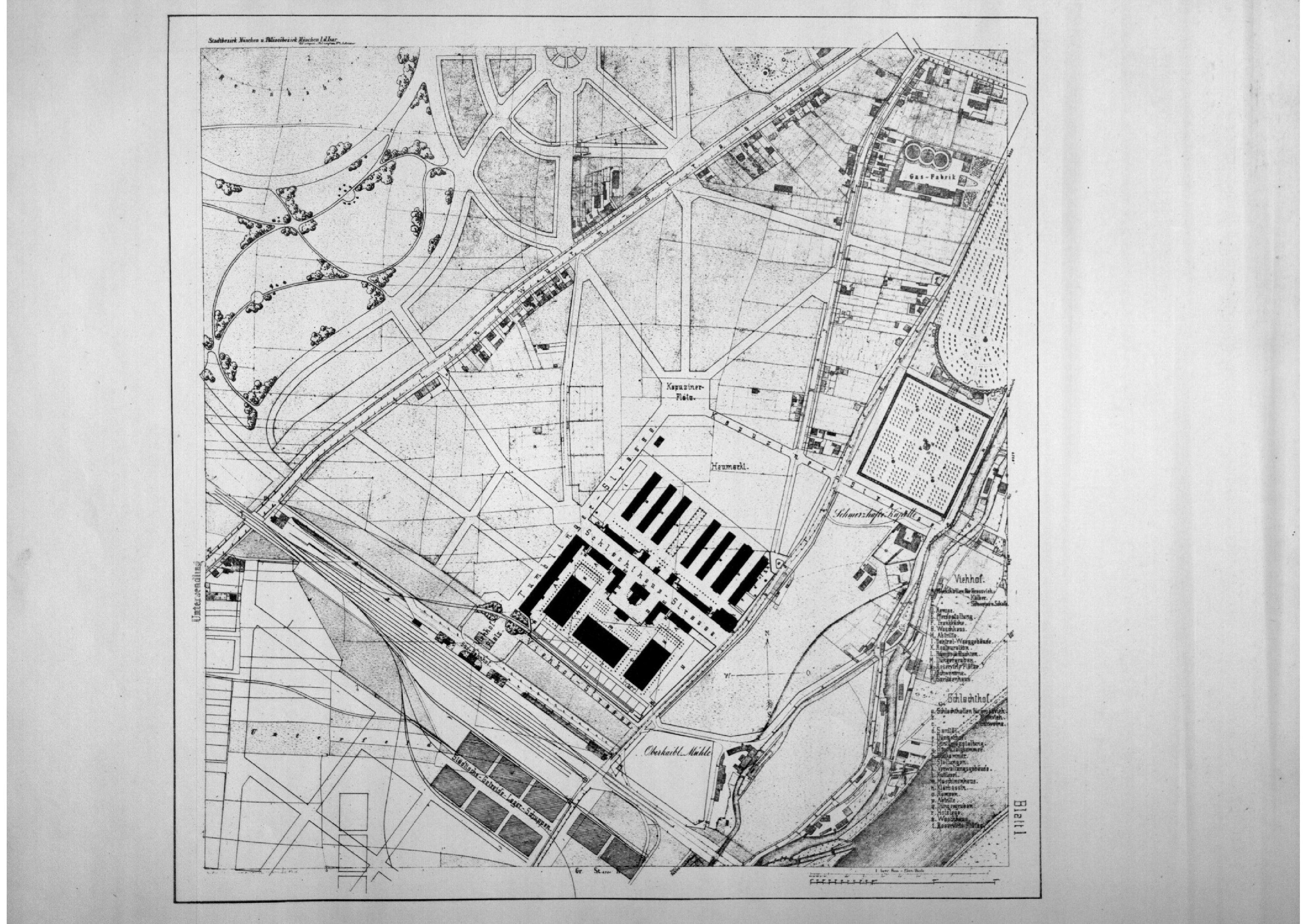Als 1791 die Münchner Stadtmauer abgerissen wurde, war die Isarvorstadt zunächst für weitere Baumaßnahmen uninteressant, da die Hochwassergefahr durch die nahegelegene Isar zu hoch erschien. Erst durch die Errichtung der Deiche und des Hochwasserbettes wurde die Gefahr gebannt und Pläne zur weiteren Bebauung rückten in den Vordergrund. 1876 entstand der zentrale Schlacht- und Viehhof. Den Plan hierfür entwarf der Architekt und Stadtbaurat Arnold Zenetti. 2 Als Standort wurde das Gebiet um den Südbahnhof gewählt, welches damals weitestgehend unbebaut war (s. Abb. 3) 3.