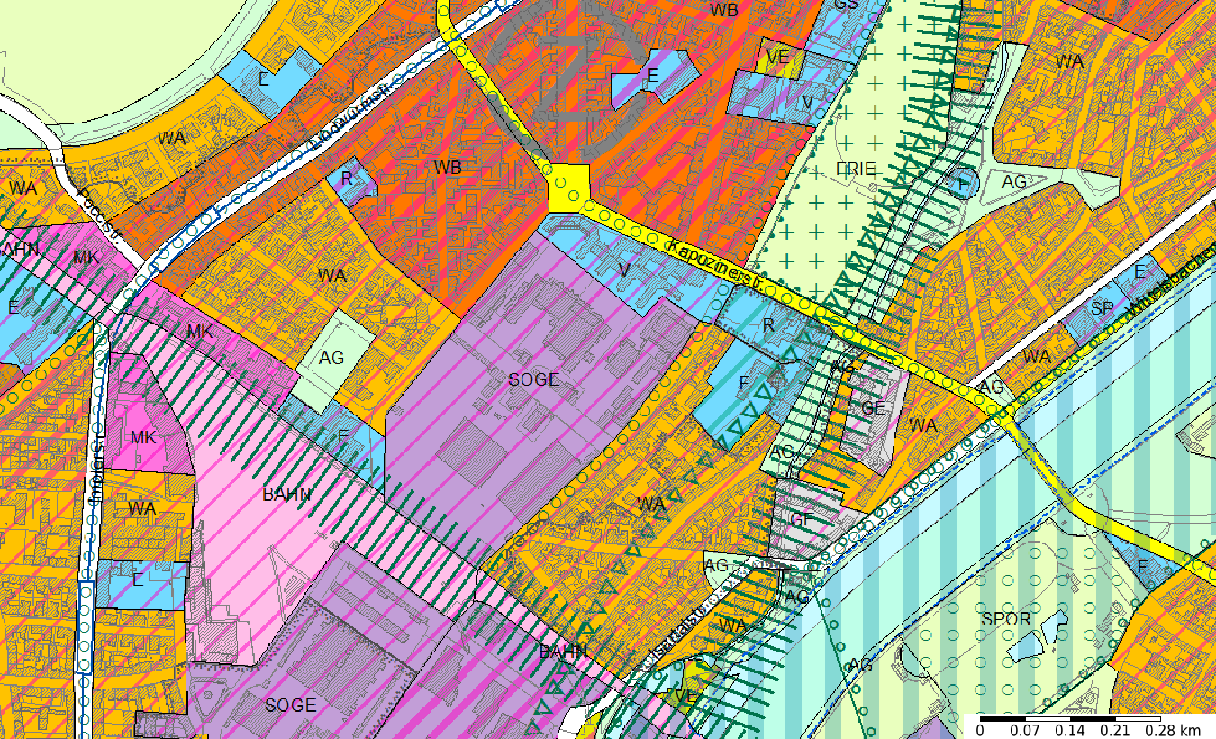 Entlang der Bahnstrecke im Westen befinden sich mehrere Flächen der Kategorie Kerngebiet. Außerdem gibt es im näheren Umkreis des Planungsgebiets einige "allgemeine Grünflächen": eine westlich des Gebiets, zwei östlich davon. Ebenfalls markant sind die Theresienwiese und der alte Südfriedhof im Norden des Kartenausschnitts. Diese fallen unter die Kategorien Sondergrünflächen (Theresienwiese) bzw. Friedhöfe (alter Südfriedhof).14