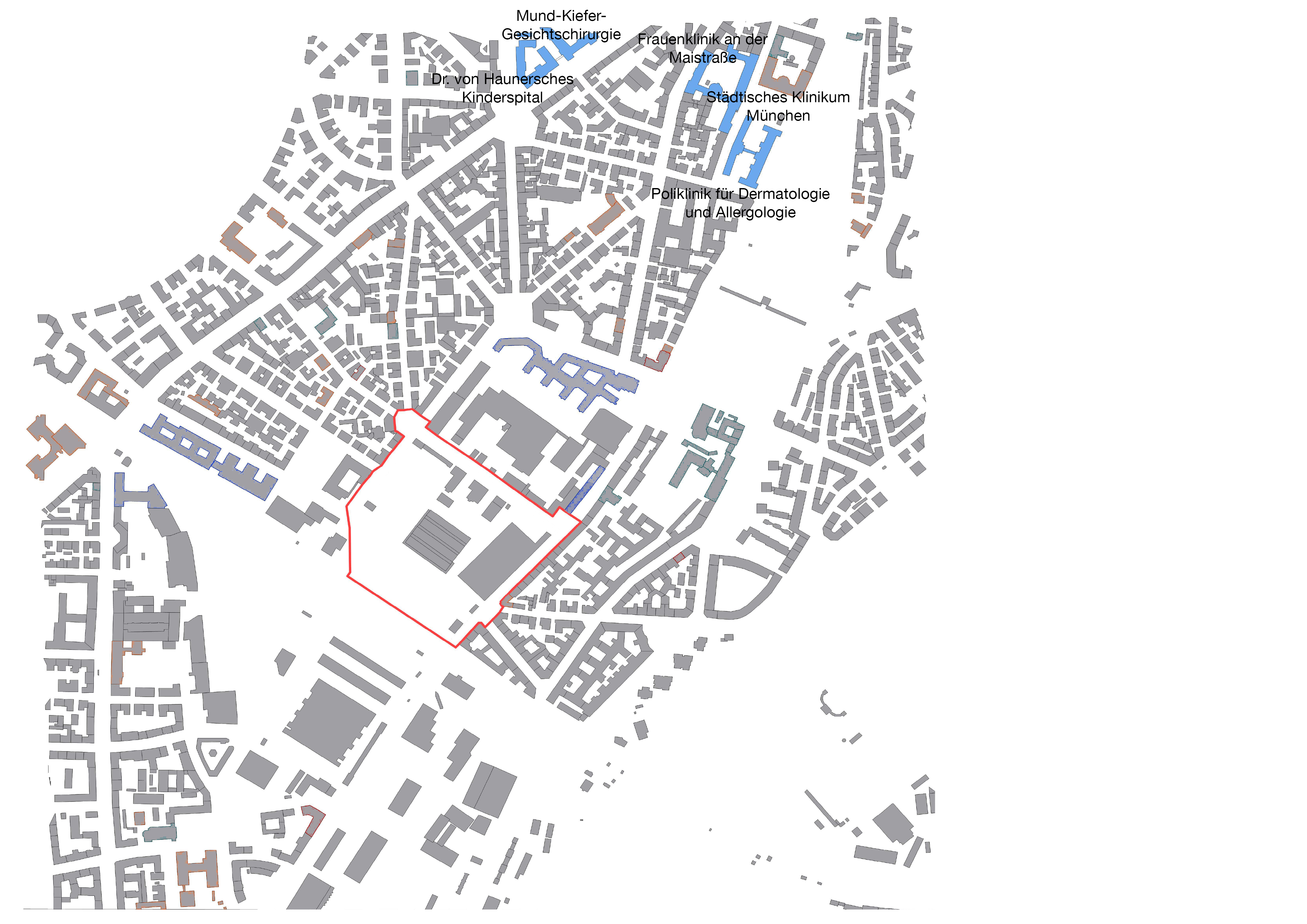 Im größeren Umkreis des Gebiets gibt es eine Poliklinik für Dermatologie und Allergologie, die Frauenklinik Maistraße, das Dr. von Haunersche Kinderspital, die Mund-Kiefer-Gesichtschirurgie und die Poliklinik Kieferorthopädie. Daran angrenzend im Norden, außerhalb des betrachteten Umgriffs, liegt das Klinikum der LMU. Die oben genannten Kliniken befinden sich etwa einen Kilometer vom Viehhof entfernt. Das Uniklinikum ist ein Lehrkrankenhaus, an dem Medizinstudenten ausgebildet werden, forschen und Patienten versorgt werden.19
