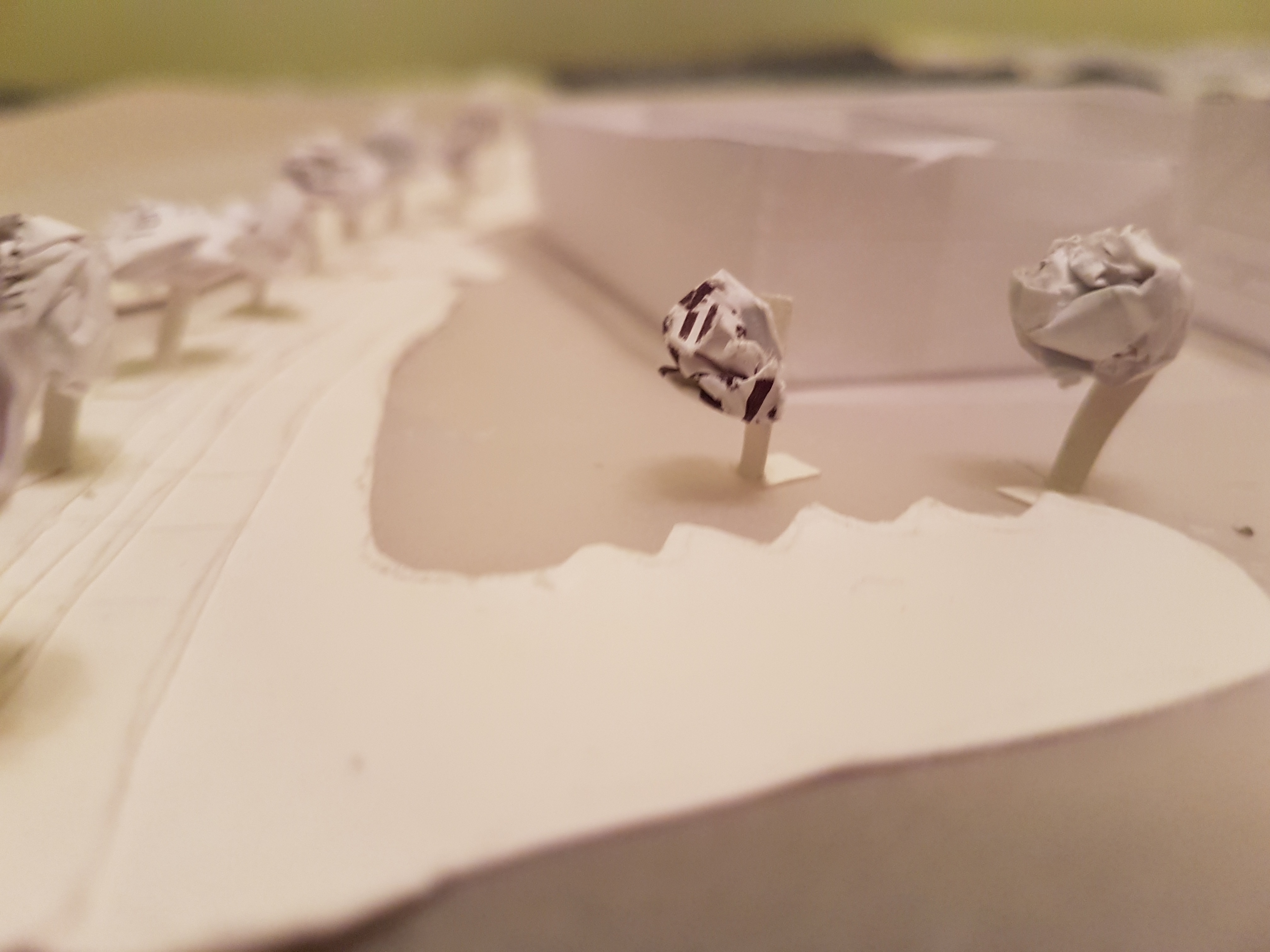 Nachdem wir jetzt alle herzlich gelacht haben, kommen wir zum eigentlichen Thema: Das Arbeiten im dreidimensionalen Gefüge. Da wir sowieso immer zu lang auf das Display des Laptops starren, dachte ich, ein selbstgebautes Modell von handwerklicher Exzellenz (wie die TUM) wäre eine gute Abwechslung für die müden Augen. Bei der Materialwahl war ich sehr darauf bedacht, so viel wie möglich aus meinem Papierkorb zu recyceln. Alte Kassenzettel dienen zerknüllt als Baumkronen, bereits bedruckte aber unbrauchbare A4 Papiere wurden zu Hauswänden. Ja sogar Finnpappe aus einem längst vergangenen Semester hat Verwendung als topographische Grundlage gefunden. Zwar hatte ich nicht das gleiche Feeling wie in Bernhards Werkstatt, das hinterbliebene Chaos ähnelte dem in Freising aber schon sehr. Mit mehr Kleber an den Fingern als am Modell haben sich aber für mich tatsächlich einige schwierige räumliche "Baustellen" im Entwurf ein wenig geklärt. Sollte ich in späteren Phasen wieder Probleme haben, werde ich vielleicht einfach aus dem Lager auf der Arbeit ein Paar Kartons "ausleihen" und daheim weiter werkeln.