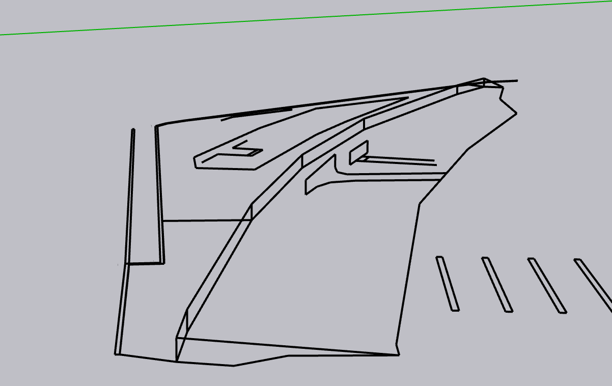 Das Erstellen des Modells und das Modell selber haben mir zwar sehr geholfen den Raum zu verstehen, aber als Arbeitsmodell gefällt mir das Ergebnis noch nicht so wirklich. Die Kanten sind alle viel zu schwammig und rund, genau wie die leicht gewellte Oberfläche. Ich will die Objekte aber sauber auf dem Boden platzieren können, ohne verschwindende Kanten oder komische Abschlüsse. Ein Modell kann ja auch immer abstrahiert sein. Mal mehr mal, mal weniger. Also sehe ich den ersten Versuch einfach als Erkenntnismodell, um nun die Rampenanlage selbst in Sketch-Up nachzubauen. Mit dem gesammelten Wissen aus dem ersten Modell wird so erstmal ein Gerüstmodell von der Rampe gebaut. Ein Zwischenstand beim Erstellen des Skeletts sah so aus:
