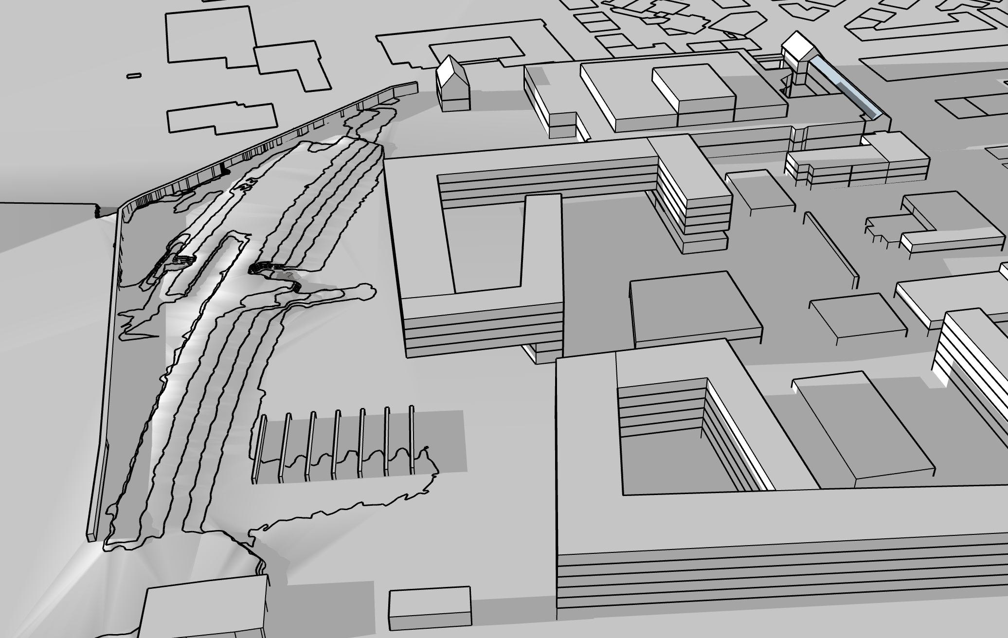 In meinem frisch gecracktem SketchUp Pro waren die Gebäude, die im Endeffekt auch mehr oder weniger händisch hochgezogen werden mussten, die eine Sache, die Modellierung der Landschaft eine ganz andere. An dieser Stelle war ich mir sicher, wie auch immer das Modellieren auf AutoCAD funktioniert hätte, es wäre weniger kompliziert gewesen als es grade mit SketchUp ist. Mein Sinn für Effizienz verabschiedete sich an dieser Stelle. Fünf Tutorials später war aber auch das hingebastelt und auch wenn das Ergebnis noch nicht top zufriedenstellend ist, stellt sich beim Umherwandern im Modell dennoch schonmal das Gefühl ein, dass sich die action gelohnt hat. (und dringend notwendig war, weil CAD Programme eben doch nicht wie Radfahren sind)