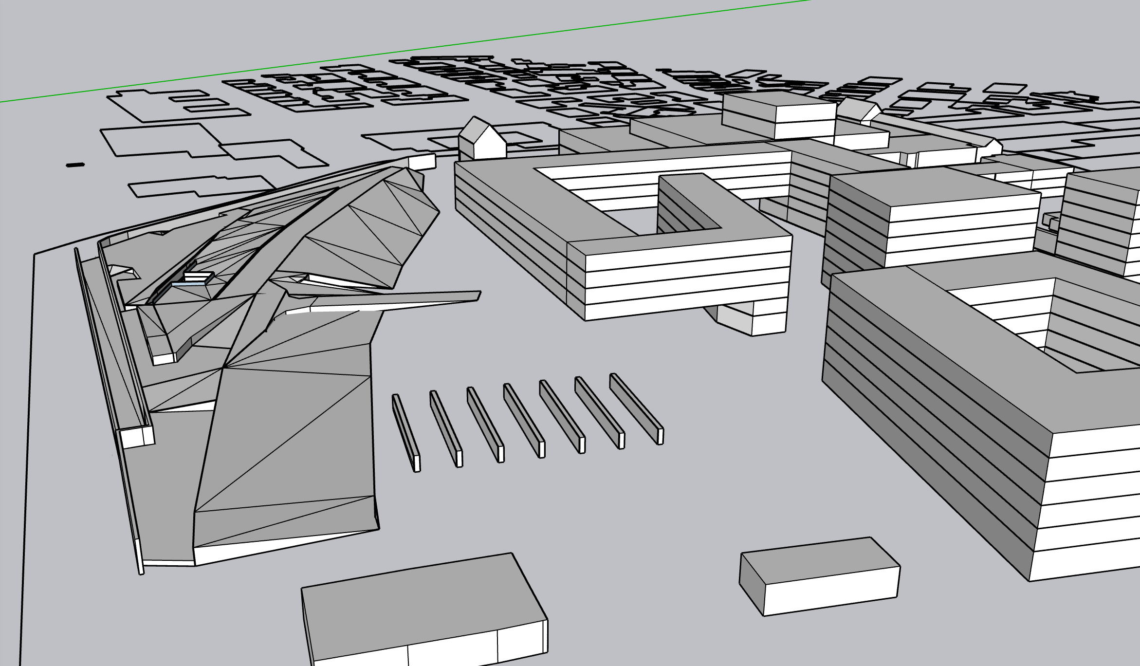Nach und nach (um einen erneuten Kollaps der Datei zu verhindern) konnte ich die Position der Bäume und Häuser in die Datei laden und endlich entstanden Räume. Wie schon so oft wurde mir ein mal mehr bewusst wie viel besser es ist am Modell zu entwerfen und sei es nur ein SketchUp Modell und kein „echtes“.