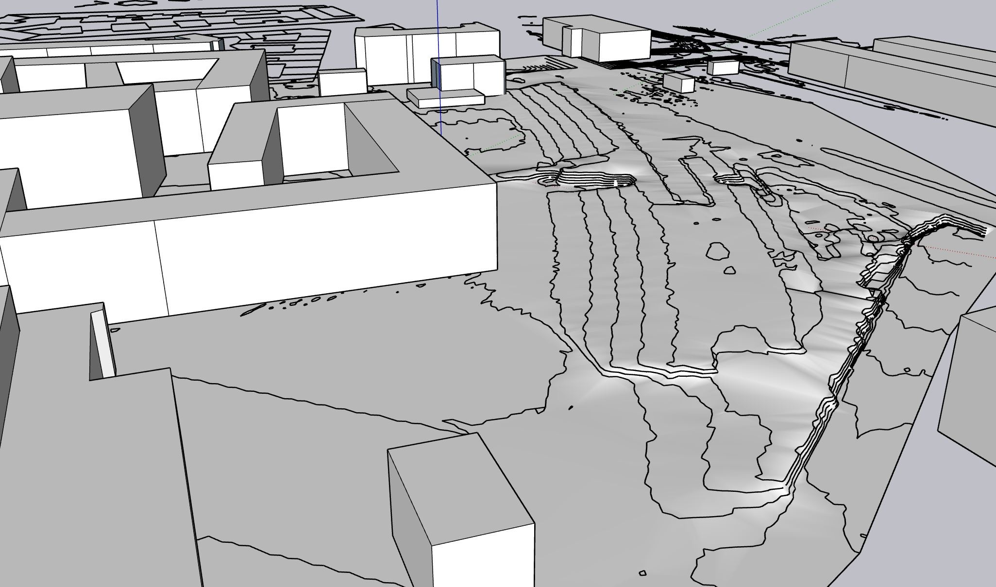 Aus Platz- und Kostengründen wird bei mir dieses Semester kein echtes Modell, sondern ein Sketch-Up Modell gebaut. Mit den bereitgestellten Höhenlinien sollte das ja ganz gut hinhauen. Also werden zuerst die Höhenlinien in Dwg-Format gebracht und in Sketch-Up eingefügt. Als Nächstes musste etwas Denkarbeit geleistet werden, weil ich die Beschriftung der Höhenlinien nicht importiert bekommen habe. Von einem selbst festgelegtem Null-Niveau aus werden den Höhenlinien die jeweiligen Höhen zugewiesen und auf der x-Achse um diese verschoben. Alles mit Unterstützung vom Google-Maps 3D-Luftbild. Das Zwischenergebnis sieht dann ungefähr so aus: