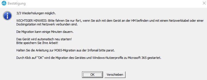 Falls Sie Windows Hello bereits eingerichtet hatten, beachten Sie bitte, dass im Rahmen der Migration eine Neueinrichtung dieser Methode erfolgt und sie erst danach wieder als zweiter Faktor verwendet werden kann. - Achten Sie darauf, dass ihr OneDrive synchronisiert ist, sonst kann es zu Konflikten kommen.