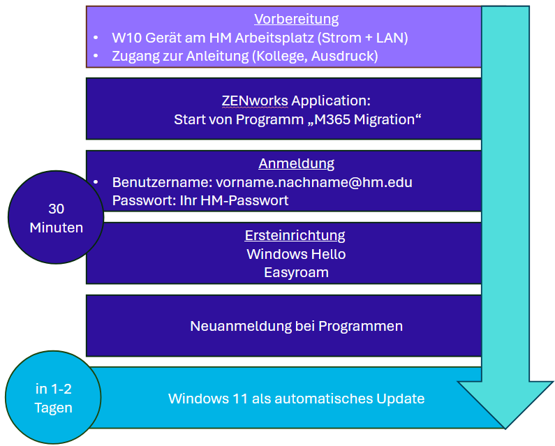 Im Zuge der Umstellung auf Windows 11 werden die Nutzer- und Rechnerprofile der HM neu angelegt, bestehende Profilinformationen migriert und zukünftig über EntraID/Intune (Microsoft) verwaltet (z. B. für Softwareverteilung, Rechteverwaltung etc.). Diesem Zweck dient die hier beschriebene Migration Ihres Profils. Diese ist für das Upgrade auf Windows 11 an der HM zwingend notwendig.