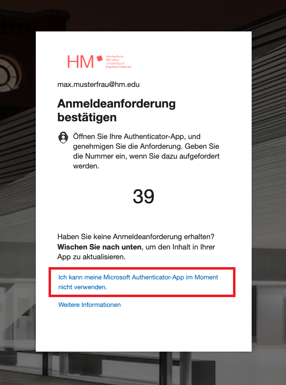 3. Auf "Ich kann meine Microsoft Authenticator-App im Moment nicht verwenden." drücken.