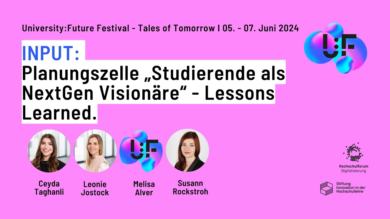 Taghanli, C., Jostock, L., Alver, M. & Rockstroh, S. (2024). Planungszelle "Studierende als NextGen Visionäre" - Lessons Learned. Vortrag auf University:Future Festival, Online, Deutschland. Verfügbar unter: https://youtu.be/lnmeqFxmdg4 | Tagungsbeitrag |
