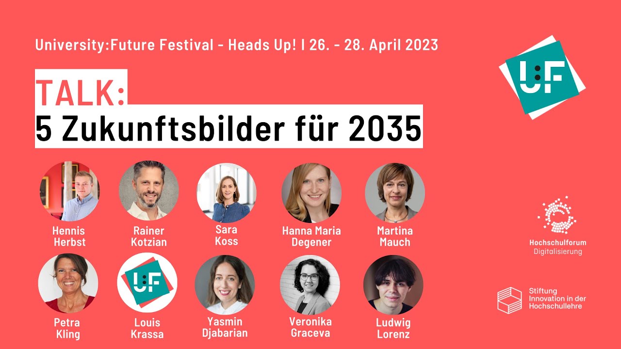 Herbst, H., Kotzian, R., Koss, S., Degner, H. M., Mauch, M., Kling, P., Krassa, L., Djabarian, Y., Graceva, V. & Lorenz, L. (2023). 5 Zukunftsbilder für 2023. Vortrag auf University:Future Festival, Online, Deutschland. Verfügbar unter: https://youtu.be/uM5k1hte_4A | Tagungsbeitrag |