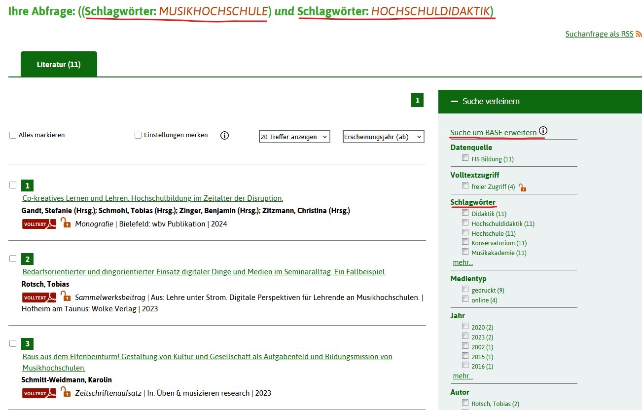 Für die Suche nach aktueller Literatur zum Thema Lehre an Musikhochschulen eignet sich der Einsatz kontrollierter Vokabulare in Katalogen und Datenbanken. Empfehlenswert dazu auch: "Strategien zur Literatursuche" aus LOTSE.