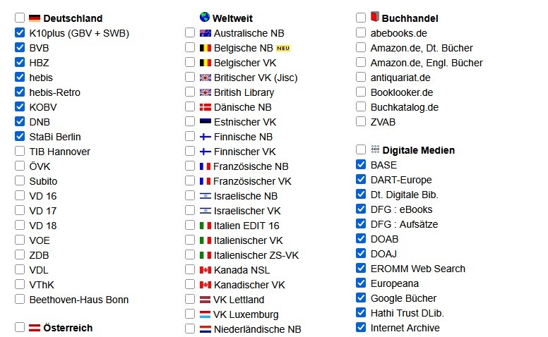 Der KVK ist eine Meta-Suchmaschine, mit der Sie gleichzeitig in allen Bibliotheksverbünden weltweit, in Buchhandelsverzeichnissen und Suchmaschinen wie Google Scholar nach Literatur, Noten und digitalen Medien suchen können. Sie eignet sich besonders, um frei verfügbare digitale Texte und Noten aufzufinden.