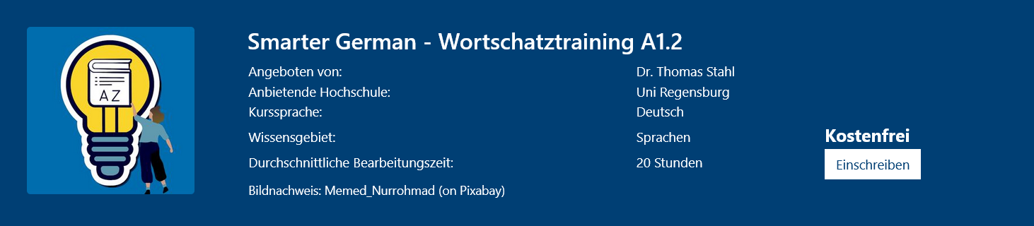 In diesem offenen Online-Kurs erweitern und festigen Teilnehmende ihren deutschen Wortschatz auf dem Niveau A1. Der Kurs vermittelt zudem effektive Lernstrategien und Merktechniken für den Wortschatzerwerb im Alltag. Anhand vielfältiger Themen werden Teilnehmende gezielt auf das Leben in Deutschland sowie den Studienalltag vorbereitet. Die Bearbeitung erfolgt flexibel im Selbststudium und erfordert keine spezifischen Vorkenntnisse.
