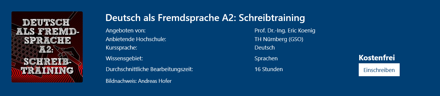In diesem offenen Online-Kurs entwickeln Teilnehmende ihre Schreibkompetenz im Deutschen auf dem Niveau A2 weiter. Ein besonderer Schwerpunkt liegt auf der gezielten Vorbereitung auf den Prüfungsteil Schreiben in gängigen A2-Prüfungen. Durch Übungen und praxisnahe Aufgaben lernen Teilnehmende, typische Schreibformate sicher zu bewältigen und ihre Ausdrucksfähigkeit zu verbessern. Die Bearbeitung erfolgt flexibel im Selbststudium und erfordert grundlegende Deutschkenntnisse auf A1-Niveau.