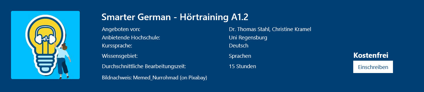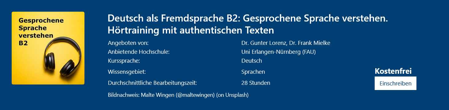 In diesem offenen Online-Kurs verbessern Teilnehmende ihre Hörverstehensfähigkeiten im Deutschen. Der Kurs vermittelt gezielt Strategien zum Verstehen einfacher Alltagstexte. Anhand vielfältiger Themen werden Teilnehmende auf das Leben in Deutschland sowie den Studienalltag an der Universität und auf dem Campus vorbereitet. Die Bearbeitung erfolgt flexibel im Selbststudium und erfordert grundlegende Deutschkenntnisse.
