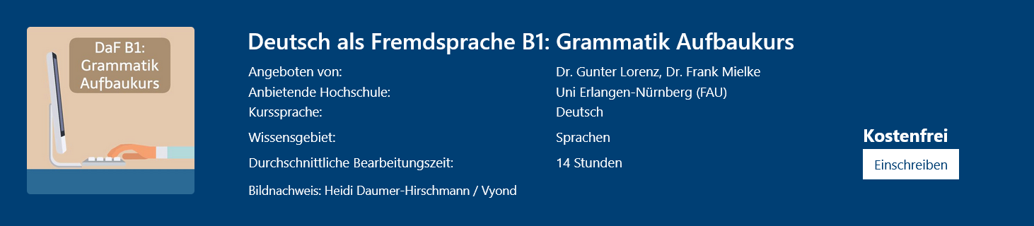 In diesem offenen Online-Kurs vertiefen Teilnehmende zentrale Grammatikkenntnisse auf dem Niveau B1. Der Kurs behandelt acht relevante Themenbereiche und baut sowohl auf ersten B1-Kenntnissen als auch auf dem Basiskurs „Deutsch als Fremdsprache B1: Grammatik“ auf. Jedes Modul kombiniert das Entdecken von Grammatik, erklärende Videos und vielfältige Übungen, sodass Teilnehmende Regeln verstehen, anwenden und festigen können. Die Bearbeitung erfolgt flexibel im Selbststudium.
