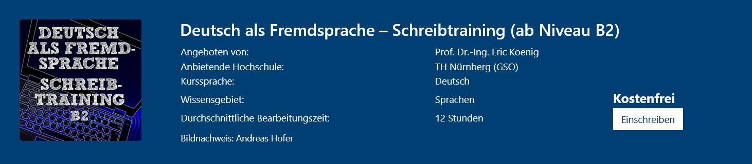 In diesem offenen Online-Kurs trainieren Teilnehmende praxisnah ihre Schreibkompetenz auf dem Niveau B2. Der Fokus liegt auf dem sicheren Einsatz wichtiger sprachlicher Strukturen und dem klaren Ausdruck komplexer Zusammenhänge. Anhand zentraler Textformen wie Beschreibungen, Anleitungen und Argumentationen entwickeln Teilnehmende ihre Schreibfähigkeiten gezielt weiter. Die Bearbeitung erfolgt flexibel im Selbststudium und setzt fortgeschrittene Deutschkenntnisse voraus.