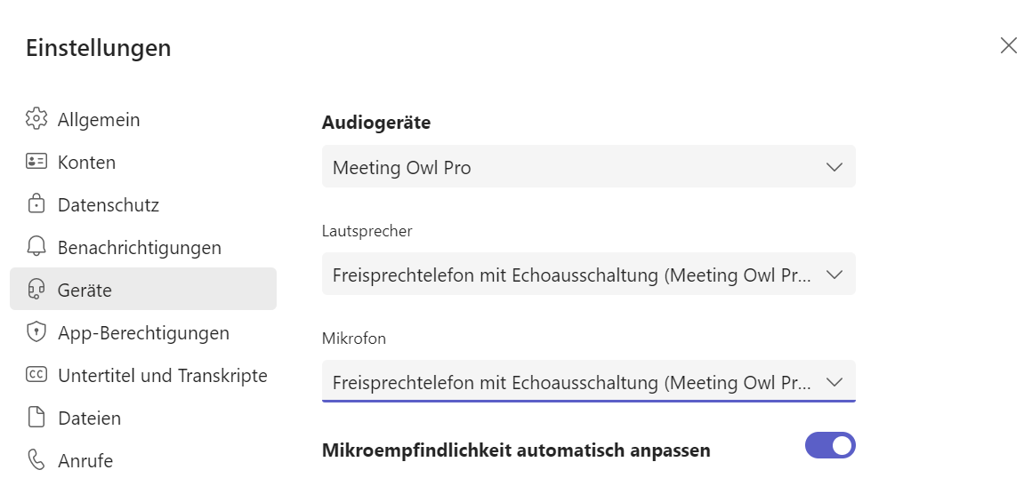 In MS Teams, under Settings/Devices, select Meeting Owl as the audio device and camera.