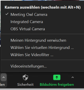 In Zoom, select "Meeting Owl Camera" as the camera. Likewise for Microphone & Speaker.