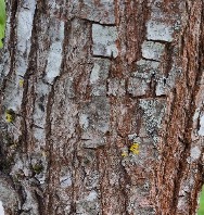 Die Rinde ist graubraun und bereits bei den jungen Bäumen stark gefurcht. Sie ist deutlich rissig und springt häufig in Platten ab.