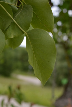 Die bis zu 10 cm langen und bis zu 5 cm breiten Blätter sind elliptisch bis eiförmig oder nahe zu rundlich. Die Spitze ist abgerundet oder kurz zugespitzt und die Basis ist abgerundet bis leicht herzförmig. Während die jungen Blätter und der bis zu 4 cm lange Blattstiel behaart sind, verlieren erwachse Blätter diese und weisen eine glänzende Oberfläche auf. Die wechselständig angeordneten Blätter verfügen über einen fein oder kerbig gesägten Rand. Oberseits ist die Färbung dunkelgrün und Unterseits ein helleres Grün. Die Herbstfärbung ist gelb oder rot.