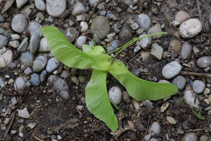 Auch der Spitzahorn trägt, wie der Bergahorn, kahle Nussfrüchte. Allerdings ist hier der Winkel zwischen den Flügelpaaren nicht ganz so eckig wie beim Bergahorn.