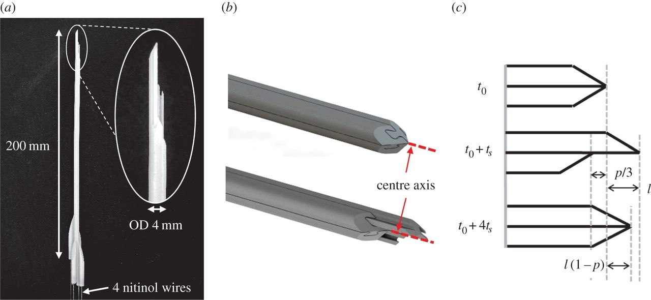 Another area of research within the EDEN2020 project is the development of needles, that cause less damage to surrounding tissue and can be targeted to the designated area more precisely. A new, biology inspired approach is a flexible needle that consists of four segments which can be moved independently, instead of a traditional needle that is inserted at a steady pace. During insertion of this needle prototype, in each iteration one segment is pushed forwards, while the other tree parts are slightly pulled back. This motion scheme reduces the strain on the surrounding tissue and reduces its disruption. In an clinical setting these are two parameters that influence the success of a procedure, since disruption and torsion of the tissue reduce the accuracy of the needle insertion. Due to the flexible nature of the needle sensitive areas can be avoided during surgery and the risk of buckling is reduced [30][31].