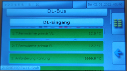 To check for the cooling activation signal, select controller “Knoten 2”, then click on DL-Bus and then “Eingänge”. The relevant signal is “Anforderung Kühlung”. Here a value of -9999°C means cooling is requested and positive value of 9999°C means no cooling is requested. The pin alignment deviates from the manual due to an error fix.