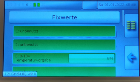 The standard factory settings did not provide  the option to set the compressor rpm externally. To enable this an additional boolean variable was included. To to monitor its value and change between temperature and rpm control, select “Knoten 12”, then click on “Fixwerte”. Here, the signal value “EIN” indicates temperature control and “AUS” rpm control respectively. Click on the light green button to change the value.