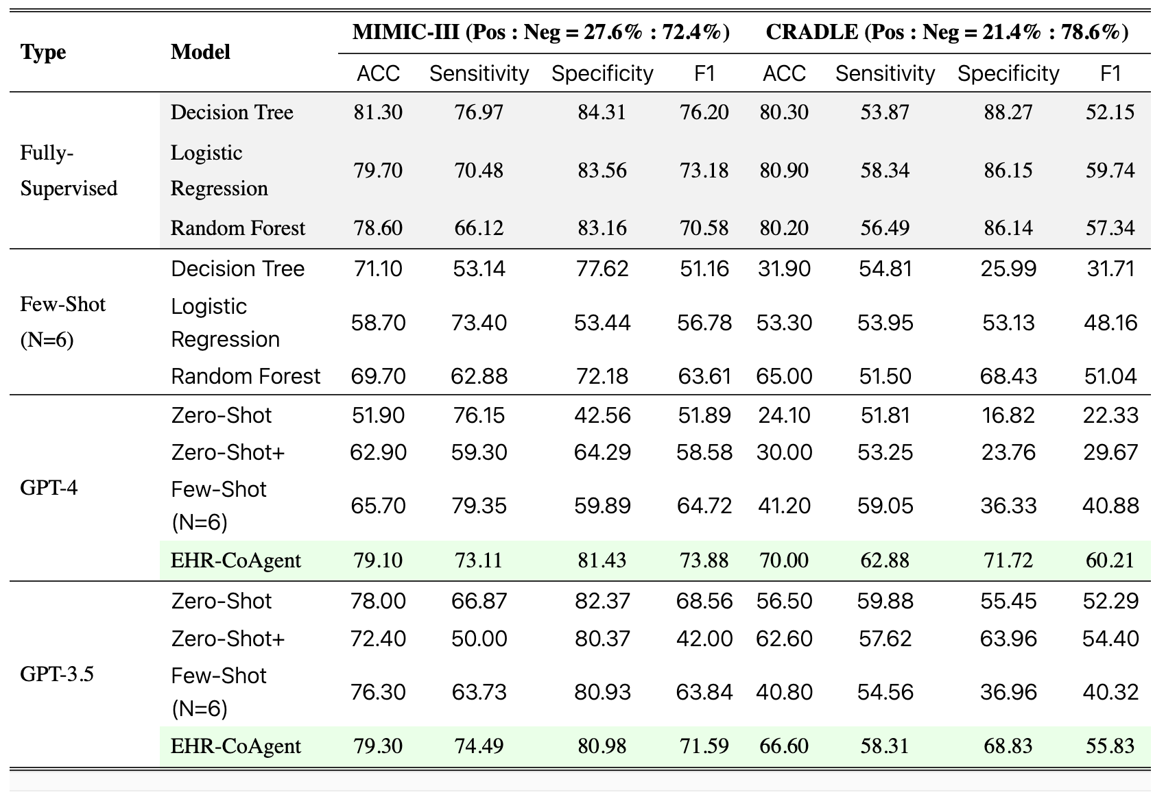 An experiment was conducted to test the proposed framework using two datasets, MIMIC-III and CRADLE. MIMIC-III is for acute conditions like Disorders of Lipid Metabolism, while CRADLE predicts cardiovascular disease endpoints in type 2 diabetes patients. Both datasets exhibited class imbalance, with lipid disorders in MIMIC-III at 27.6% and cardiovascular disease endpoints in CRADLE at 21.4%. Accuracy, sensitivity, specificity, and F1 score metrics were utilized for evaluation. The study evaluates the performance of EHR-CoAgent compared to traditional machine learning methods like Decision Trees, Logistic Regression, Random Forests, and single-agent LLM approaches using GPT-4 and GPT-3.5. The LLM models are evaluated in zero-shot, zero-shot with additional prompt information, and few-shot learning settings, while the ML models are trained in fully supervised and few-shot settings. The study aims to compare the different models to assess the advantages of using traditional Collaborative LLM agents over traditional methods.