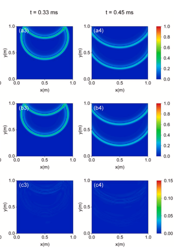 Based on the results of Wang et. al [12], their used PINNs achieved great performance. They implementedtwo models, one homogeneous and one inhomogeneous. The first one achieved a maximum error of less than 3% when predicting the amplitude and position of the wave. For their inhomogenous model the maximum error was a bit higher, around 8%, which is due to the inherent complexity of the inhomogeneous model. One reason for this poorer performance is, that the velocity model has some discontinuity which also leads to discontinuity in the second order gradients of the wave fields, which are more complex to learn.