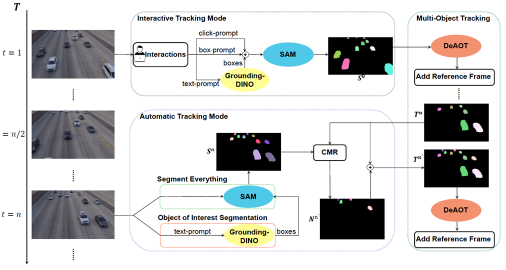 The interactive and referring VOS model, SAM-Track, presents a comprehensive framework for video segmentation. This system unifies the Segment Anything Model (SAM) with an AOT-based tracking model (DeAOT) and Grounding-DINO to facilitate text-based interactions. SAM-Track enables precise and effective segmentation and tracking of objects in video sequences via multimodal interactions or automated methods.