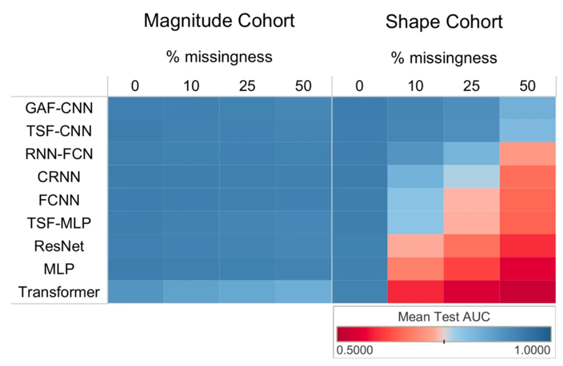 GAF-CNN was robust over various degrees of missingness with AUCs of 0.93, 0.92, 0.90, and 0.83 for missingness of 0%, 10%, 25%, and 50%, respectively. TSF-CNN performed comparably with AUCs ranging from 0.93 0.91, 0.89, and 0.81 for 0%, 10%, 25%, and 50% missingness. Models that were the most detrimentally impacted by missingness were Transformer, MLP, and ResNet with respective AUCs of 0.52, 0.55, and 0.59 at 50% missingness.