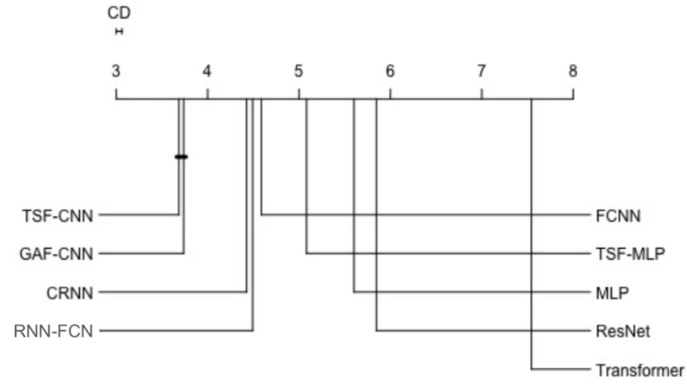 Overall model accuracy was determined using a Friedman test to evaluate model AUCs. TSF-CNN was ranked as the best model but was not statistically significantly better than GAF-CNN, which was ranked second (P > 0.05). These models were followed by CRNN, LSTM-FNC, FCNN, TSF-MLP, MLP, ResNet, and Transformer, respectively, and these were all statistically significantly different from each other (P < 0.05)