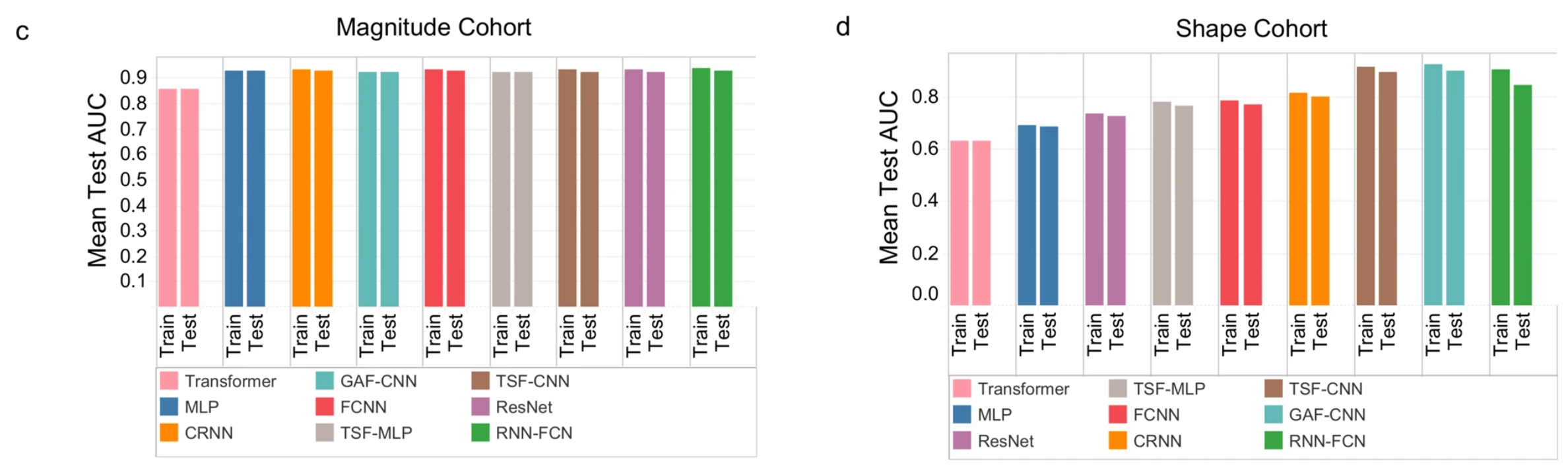 All DL models demonstrated similar accuracies between the training and test sets in the magnitude cohorts (AUCs ~0.92). The difference in AUCs between the test and training sets was negligible with the highest difference observed with ResNet, which had a mean AUC difference of 0.0015. More substantial model overfitting was observed in the shape cohort. TSF-CNN demonstrated the least model overfitting with a difference in AUC of 0.0051, and RNN-FCN demonstrated the greatest model overfitting with a difference in AUCs between training and test cohorts of 0.0227.
