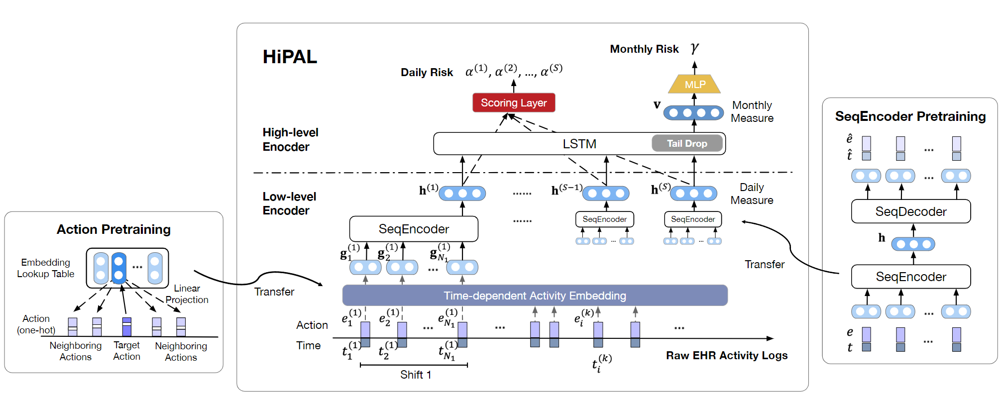 This includes a pre-trained time-dependent activity embedding mechanism specifically designed for activity logs, a hierarchical predictive model capable of capturing physician behaviors across multiple temporal levels, and a semi-supervised framework that leverages knowledge from unlabeled data. Importantly, the HiPAL framework is adaptable and can be built upon any convolution-based sequence model as its foundational base model.