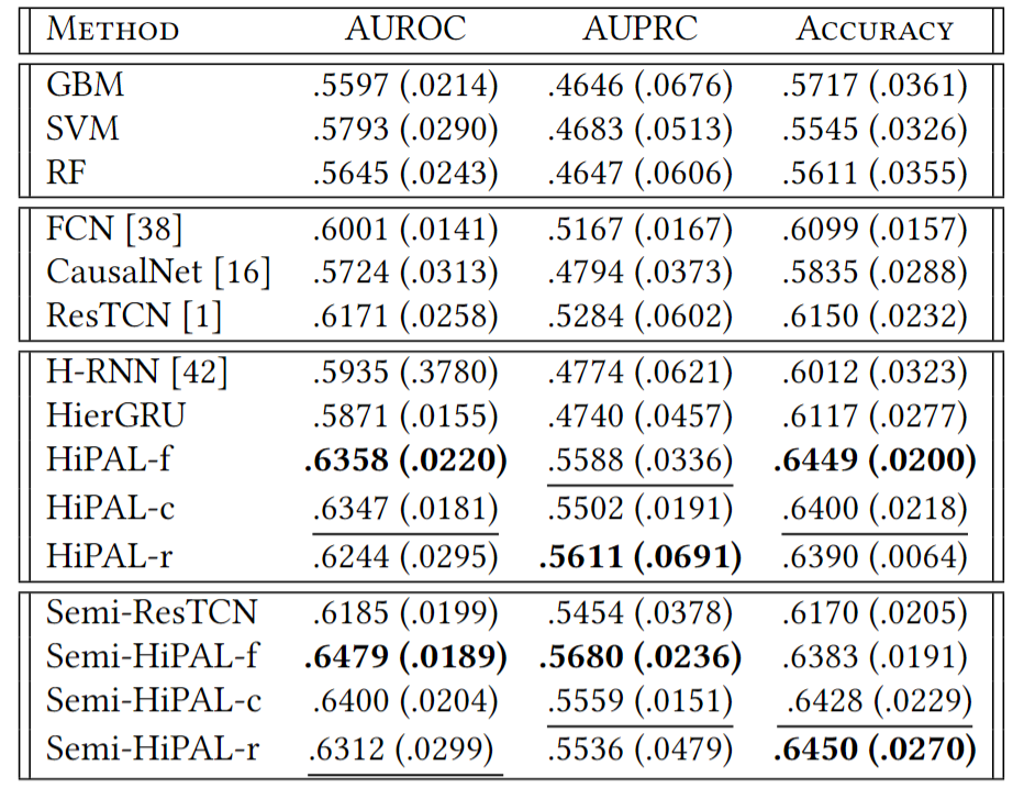 - As variants of the proposed hierarchical framework, HiPAL-f, HiPAL-c, and HiPAL-r corresponds to the HiPAL-based predictive model with the low-level encoder Φ instantiated by FCN, CausalNet, and ResTCN.