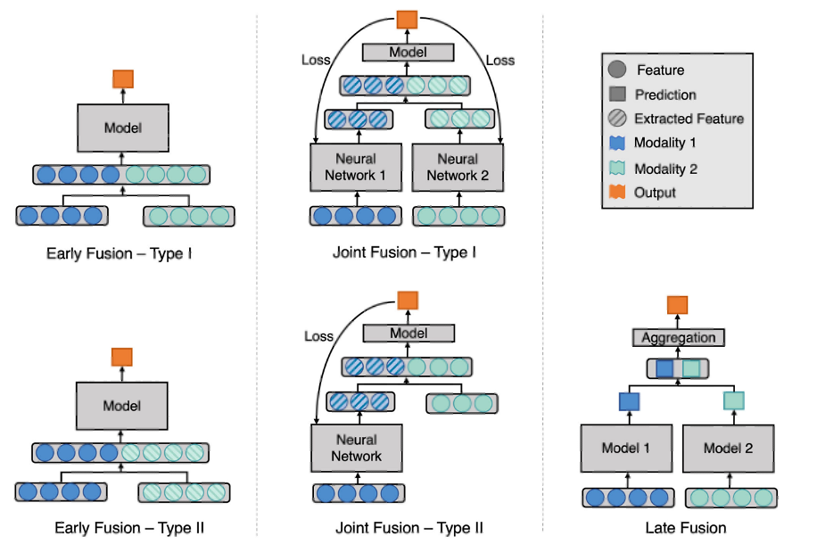 As shown in Figure 1, there are three different approaches are frequently utilized for multimodal learning. Input-level fusion, sometimes referred to as feature-based fusion or data-based integration, is the first type. Using this approach, a standard feature vector that integrates the multiple input modalities is fed into a neural network. Layer-level fusion, also referred to as joint fusion or intermediate integration, is the second technique. It combines feature representations that have been learned from intermediate layers. The features of each modality are fed to an independent neural network and the learned representations through those neural networks are combined and fed to the rest of the model. The third approach, referred to as late or model-based integration or decision-level fusion, involves combining the predictions of many models. Each modality is used to train a single neural network. The outputs of the networks are then aggregated to get the final result [1],[2].
