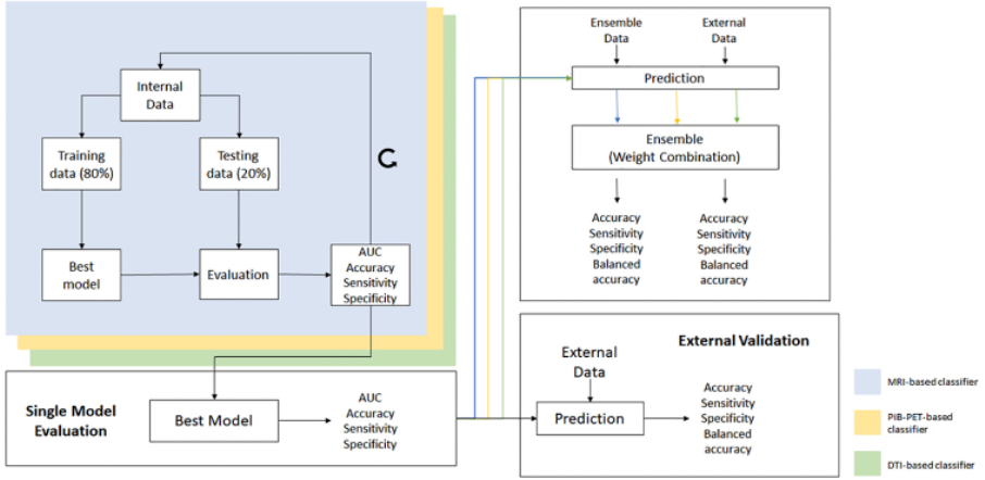 The paper’s strength lies in its comprehensive approach, which uses ensemble and base classifiers in order to investigate all possible combinations of imaging modalities. It has been demonstrated that the combination of multiple imaging modalities, both structural and functional, improves the accuracy of classification. Also, the use of external data for validation makes the approach more robust as it ensures the generalizability of the findings beyond the initial internal dataset. Nevertheless, the adoption of a late fusion strategy might not completely take advantage of the complementarity and correlations between the different imaging modalities. Also, the learning process may be affected by the aggregation design choice, which is a simple weighting function in this study.