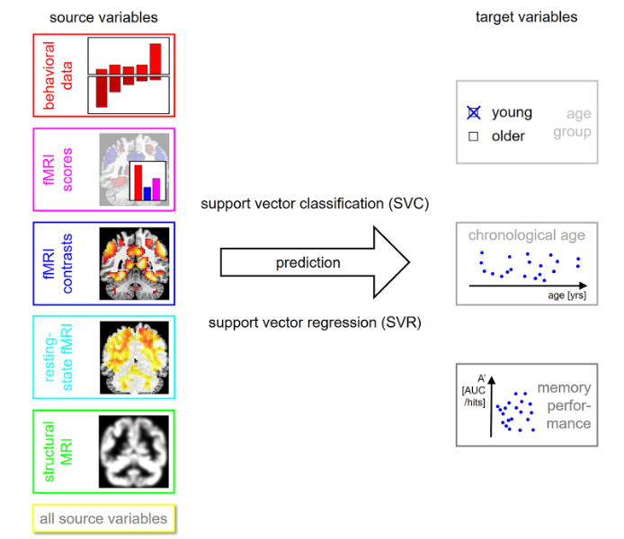 The internal dataset used was collected from structural MRI and functional MRI scans on a sample of 106 young and 153 older subjects. Statistical Parametric Mapping (SPM12) was used for data preprocessing. As shown in Figure 4, multiple source variables were extracted including structural MRI maps (Gray matter volume maps from T1-weighted images), resting-state functional MRI maps, fMRI contrast images, fMRI summary statistics, and behavioral data that represent behavioral response frequencies from a surprise recognition memory test carried out by the participants. Target variables were also extracted for each subject to be used for prediction analyses: age group (young or older), chronological age (in years), and memory performance. Following the extraction of the source and target variables, multiple analyses were carried out, each of which involved utilizing SVMs to predict a single target variable from a feature set of source variables. The age group was predicted using support vector classification (SVC), while chronological age and memory performance were predicted using support vector regression (SVR).