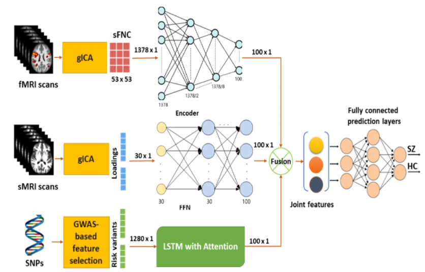 For the first feature extraction submodule, to extract functional and structural networks from the respective scans, a fully automated independent component analysis ICA-based pipeline was applied. It runs gICA for both structural and functional scans with specific settings such as the number of independent components expected. For functional MRI scans, a static functional network connectivity (sFNC) matrix representing the strength of connectivity between the different components is computed. For structural MRI scans, the ran gICA constructs the ICA loading matrix, showing how much each voxel contributes to the overall pattern represented by the specific independent component. SNPs are generated from the genomic sequence.